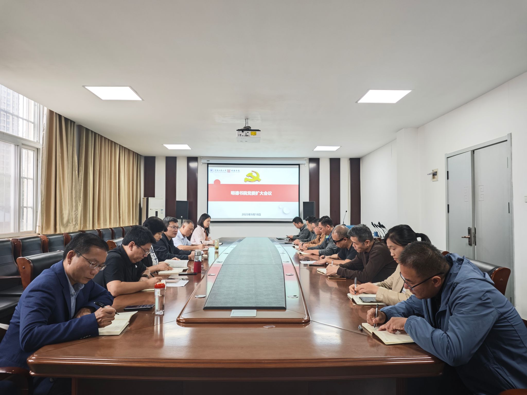 在207会议室召开党委扩大会议,深入学习习近平总书记关于深入贯彻中央八项规定精神的重要指示。书院全体党委委员、各科室负责人、各党支部书记参加会议。会议由书院党委书记魏朝举主持。