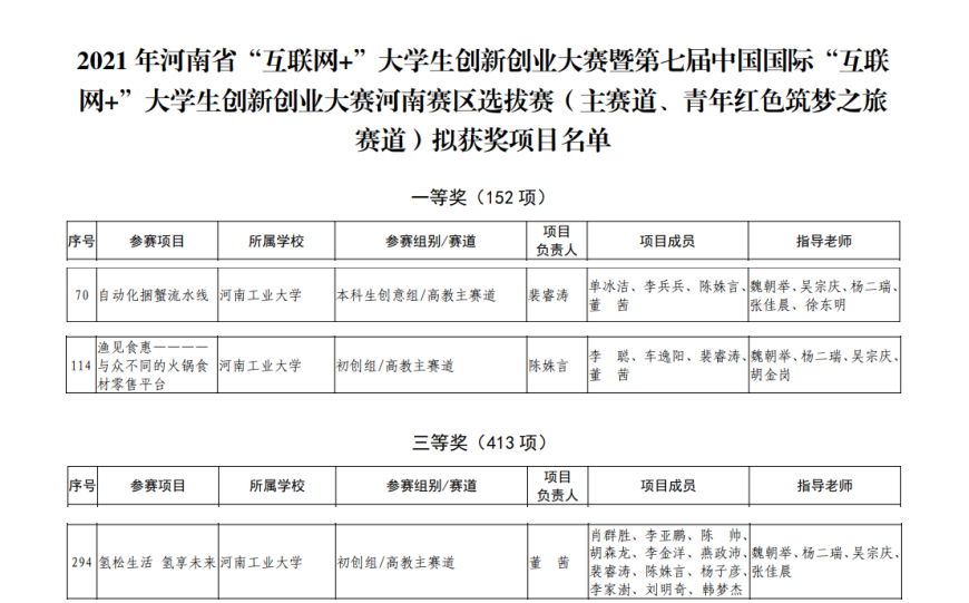 三个学生团队项目入围省赛评选,最终荣获两项一等奖、一项三等奖的成绩,其中《自动捆蟹流水线》项目和《渔见食惠—与众不同的火锅食材零售平台》项目分别斩获高教-创意组和高教-初创组一等奖,并入围河南省国赛集训队。《氢松生活 氢享未来》项目获得高教-初创组三等奖。学院获奖数量和质量均创新高。魏朝举、杨二瑞、吴宗庆、张佳晨、胡金岗、徐东明老师荣获优秀创新创业指导老师奖。