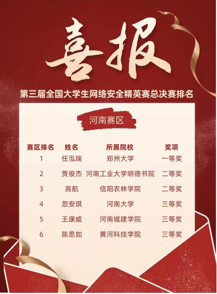 该项赛事由中国信息安全测评中心指导,国家网络空间安全人才培养基地主办。通过竞赛,使大学生更全面地掌握网络安全知识,进一步提升网络安全意识和网络安全技能,深入加强信息化环境下企业信息安全保护能力,使全国广大在校学生在信息意识普及和知识技能提升方面更好地展示自身能力,为其顺利进入工作岗位打下良好的基础。自10月21日开始,大赛得到了全国上百所高校与老师的支持和重视,吸引了全国数十万人报名参与,其中通过初赛进入复赛的选手有1万余人,经过复赛的激烈角逐后,选拔出100名选手进入总决赛。晋级总决赛的选手通过知识问答+单人CTF竞赛的方式进行,经过80分钟的比拼,最终共有90人获奖,其中河南赛区有6人名列前茅。