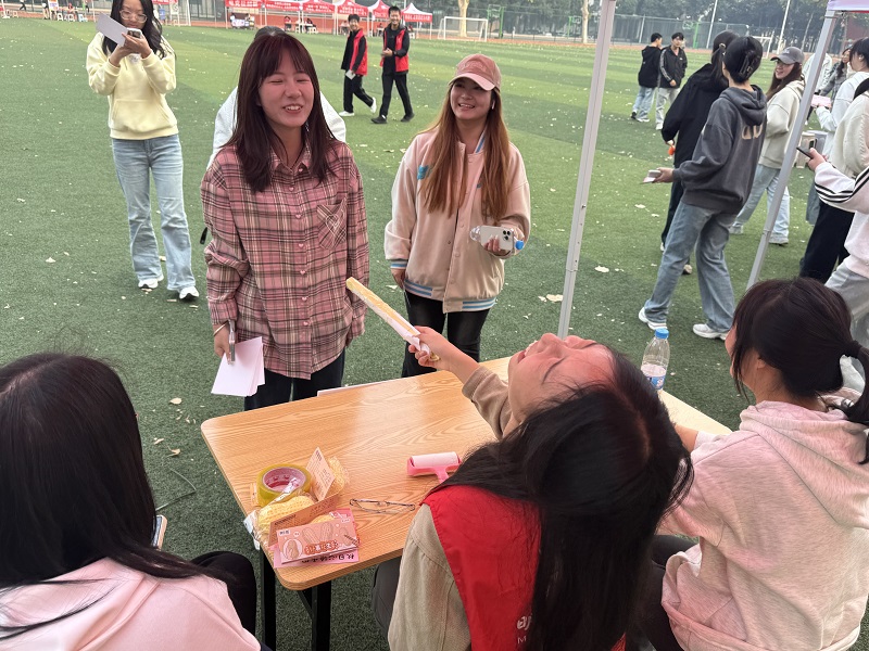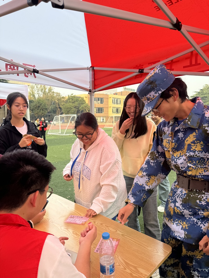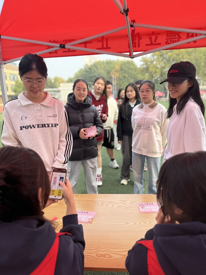 本次活动精心设置“你画我猜”、“齐心排‘雷’”、“数字‘炸弹’”等六个生动有趣的小游戏,为每位参赛者提供一张打卡卡片,每顺利完成一项小游戏,便可进行一次盖章打卡,最终可依据印章数量兑换不同奖品。“你划我猜”锻炼参赛者的专注和想象力;“齐心排‘雷’”培养了学生的创造性思维和团队精神;“圈中‘宝藏’”以套圈的方式锻炼同学们的手眼协调能力;“数字‘炸弹’”提升了同学们的反应能力和判断能力;“321看这边”考验参赛者的默契与专注;“绕口令”和“读颜色不读字”展现了参赛者敏捷的反应速度。游戏过程中,参赛者们时而沉思,时而“大展拳脚”,充分体验到了动脑攻克难关的成就感和团队合作的巨大力量。操场上回荡着同学们体验到游戏乐趣的欢声笑语和成功打卡的兴奋呼喊,气氛欢快且热烈。